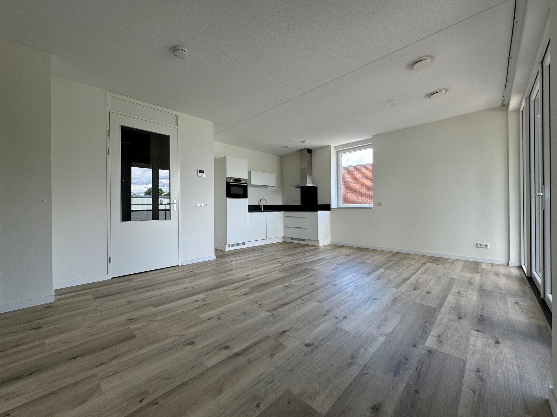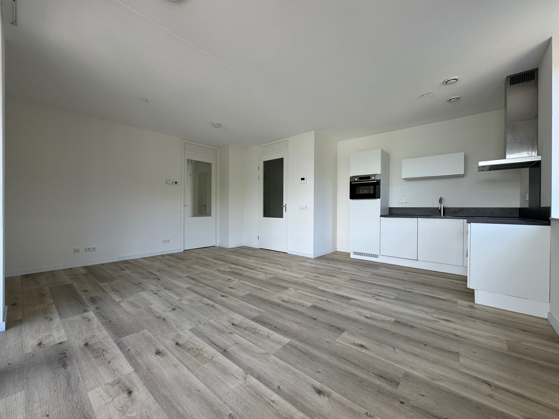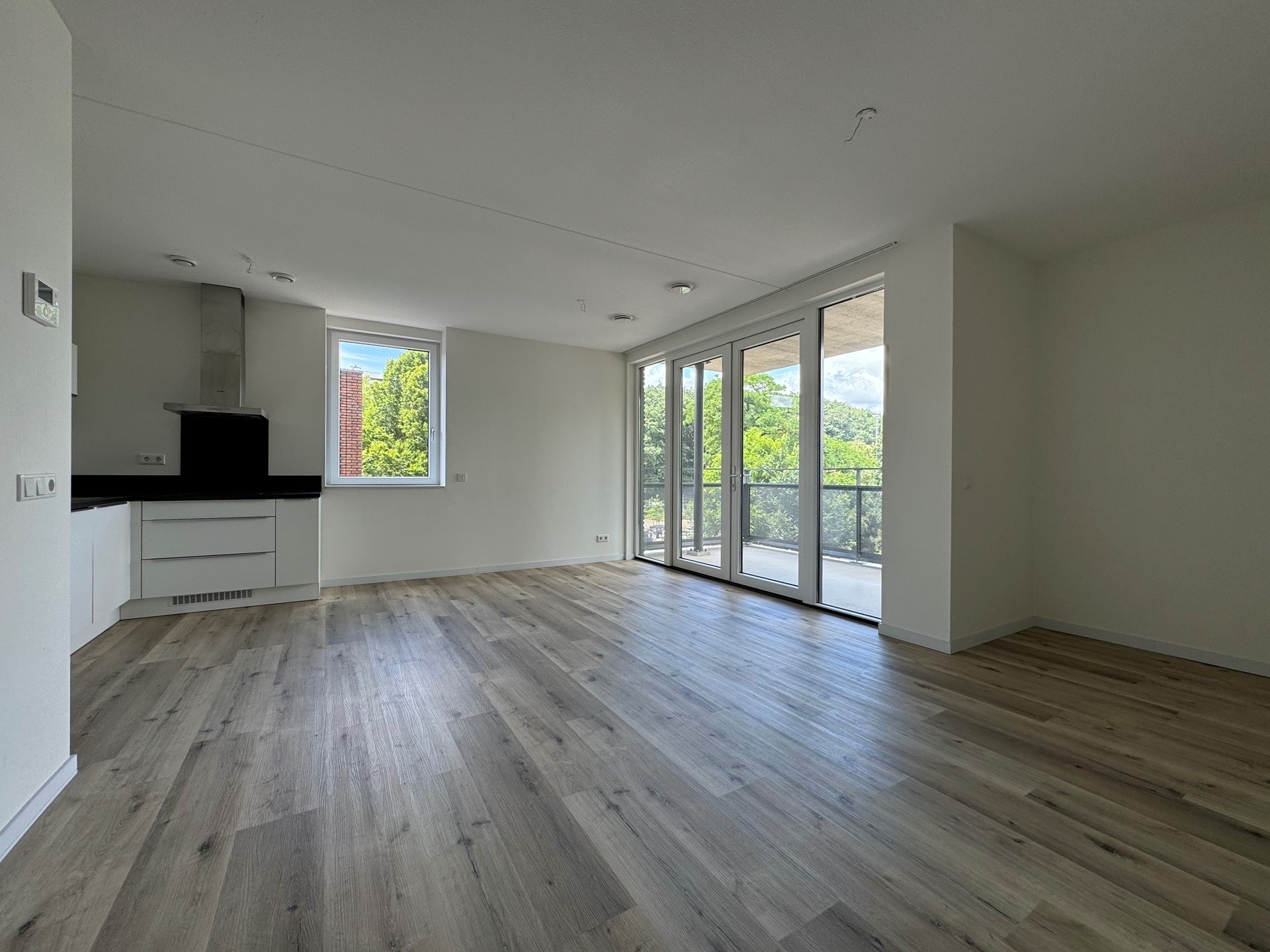 Entree appartement, hal met meterkast, ruime woonkamer met veel lichtinval, videofoon en openslaande deuren die toegang geven tot het aangrenzende balkon, open keuken met inbouwapparatuur waaronder een combioven, vaatwasser, koelkast, inductiekookplaat en afzuigkap, gang, technische ruimte met wasmachineaansluiting, separaat toilet (hang) met fonteintje, badkamer met inloopdouche, designradiator, tweede toilet (hang) en een breed wastafelmeubel, twee ruime slaapkamers