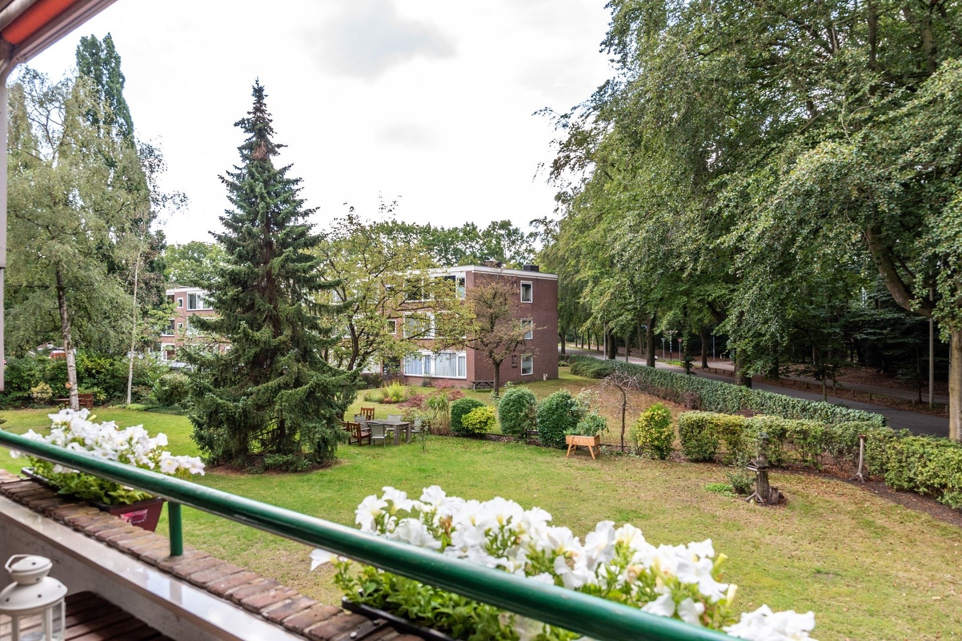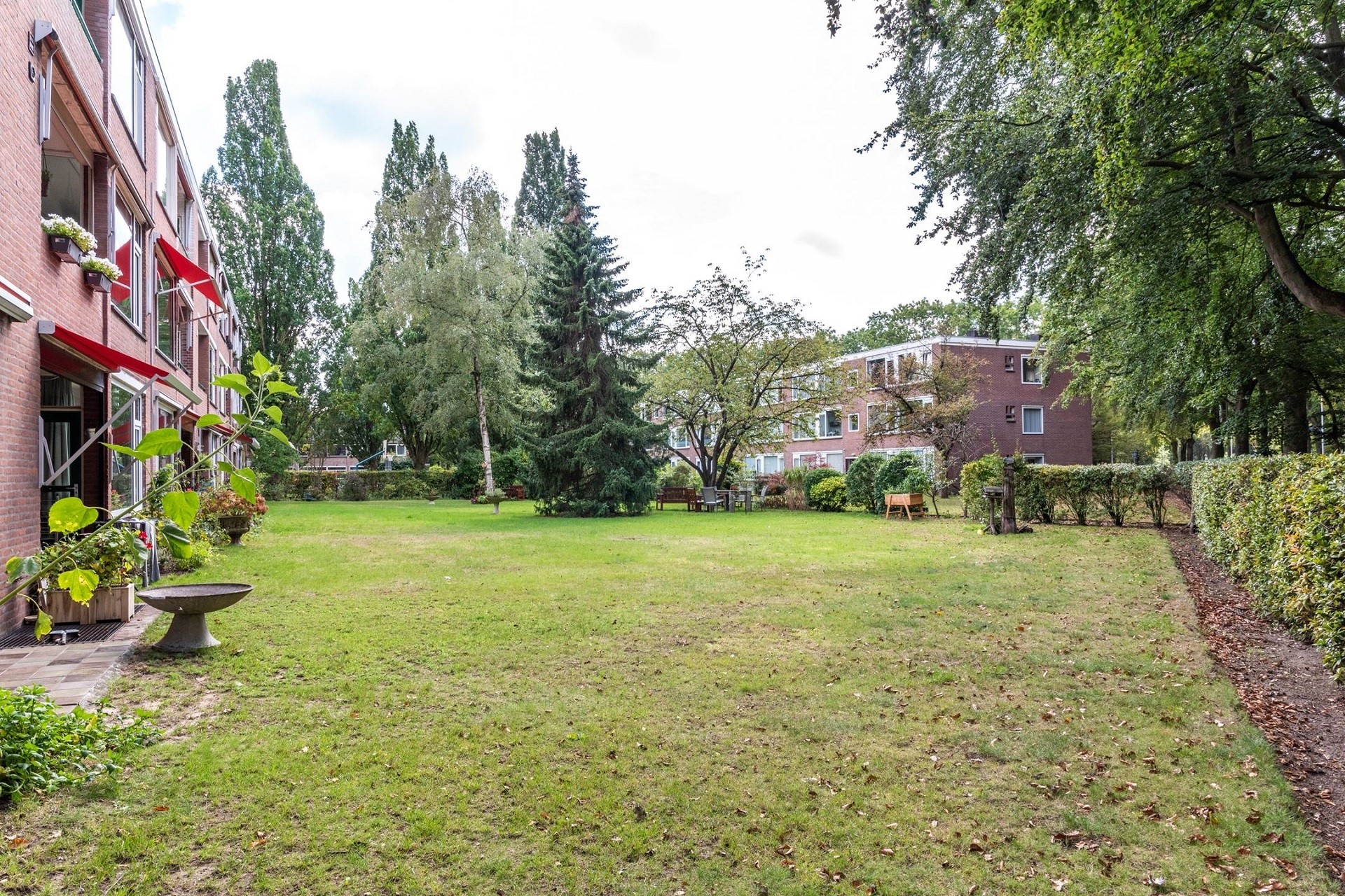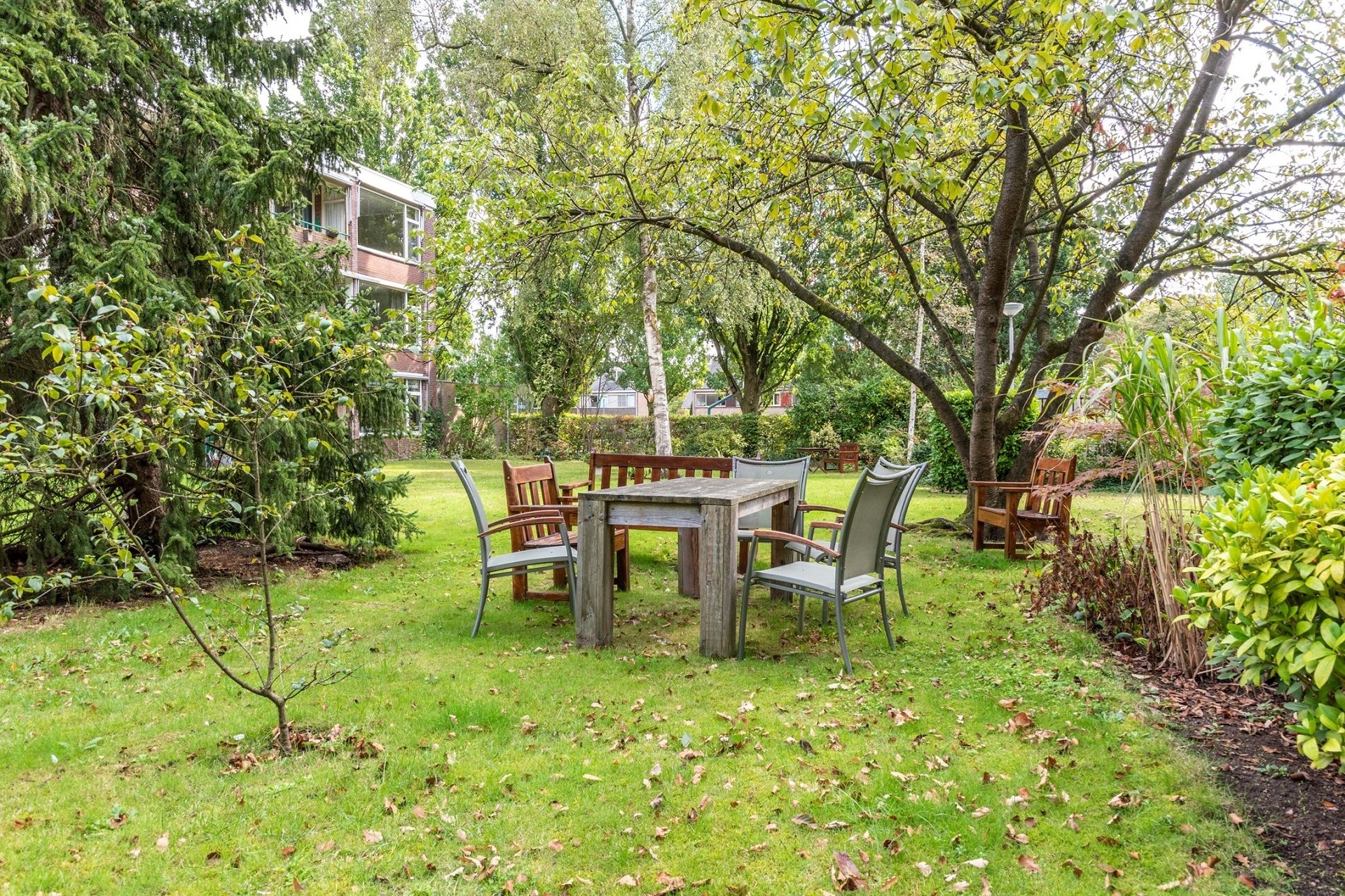 De tuin aan de achterkant van het complex is voor gemeenschappelijk gebruik van de bewoners