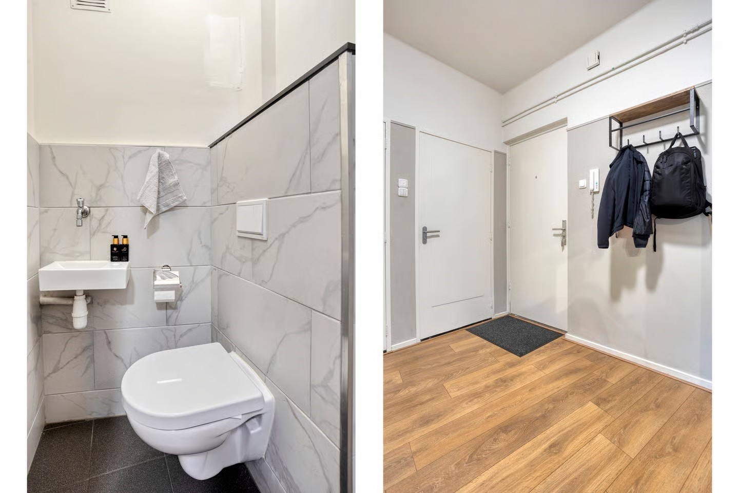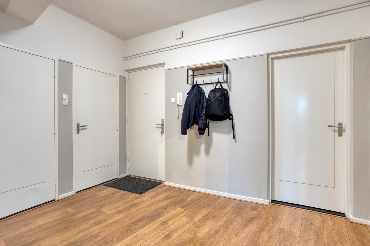Entree appartement, ruime hal, separaat toilet (hang) met fonteintje, wasruimte met wasmachine, badkamer met douche en wastafel, royale slaapkamer, keuken met apparatuur waaronder een gaskookplaat, afzuigkap, oven, vaatwasser en koelvriescombinatie en toegang tot het aangrenzende balkon, royale woonkamer met grote raampartijen en toegang tot het balkonnetje aan de voorzijde, slaap-werkkamer